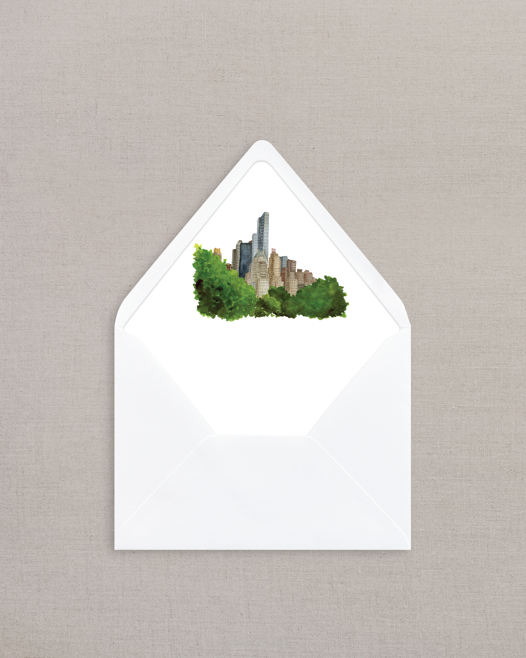 Euro Flap Eggshell Envelopes (Bright White or Off-White) with digital print liner depicting a watercolor painting of the New York City skyline from Central Park.