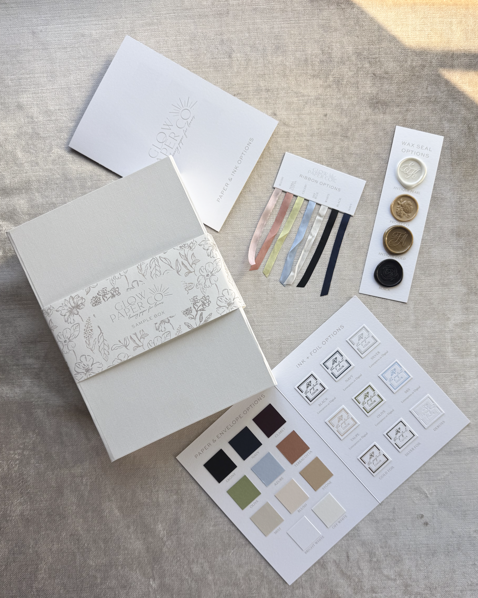 Choosing your wedding paper is a tactile experience—and our Sample Box brings it right to your doorstep. Inside, you’ll find a beautifully assembled selection of printed cards from our Semi-Custom Collection, swatches, and a few other goodies. Touch, compare, and fall in love with the quality and colors before designing your own. A $40 coupon code is included that you can use toward your Semi-Custom, Custom or Fine Art Invitations.
