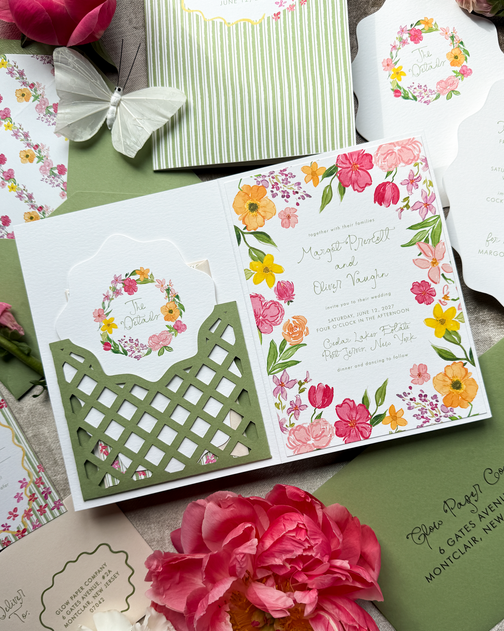 - Digitally printed folder with laser cut Olive lattice pocket, invitation mounted inside