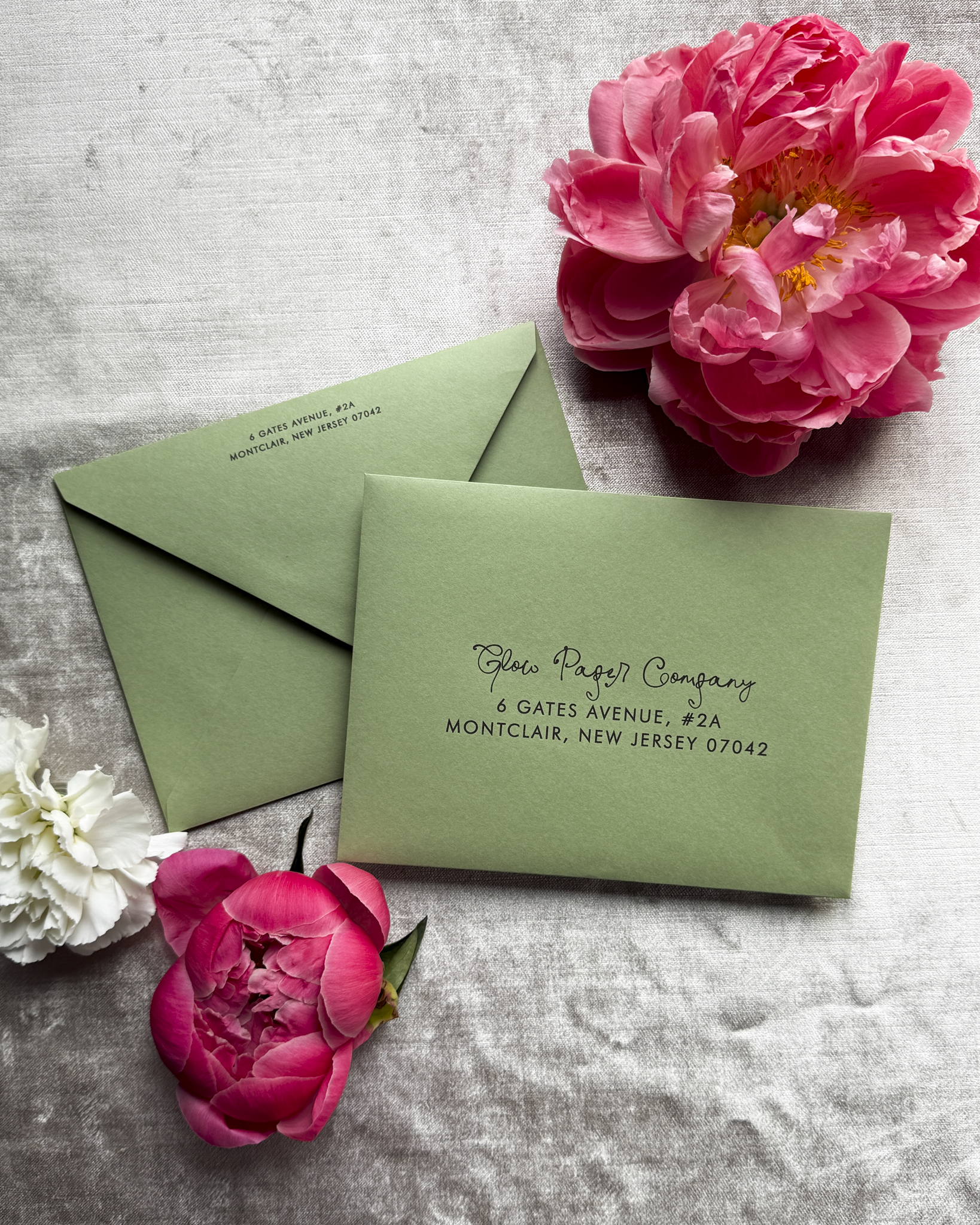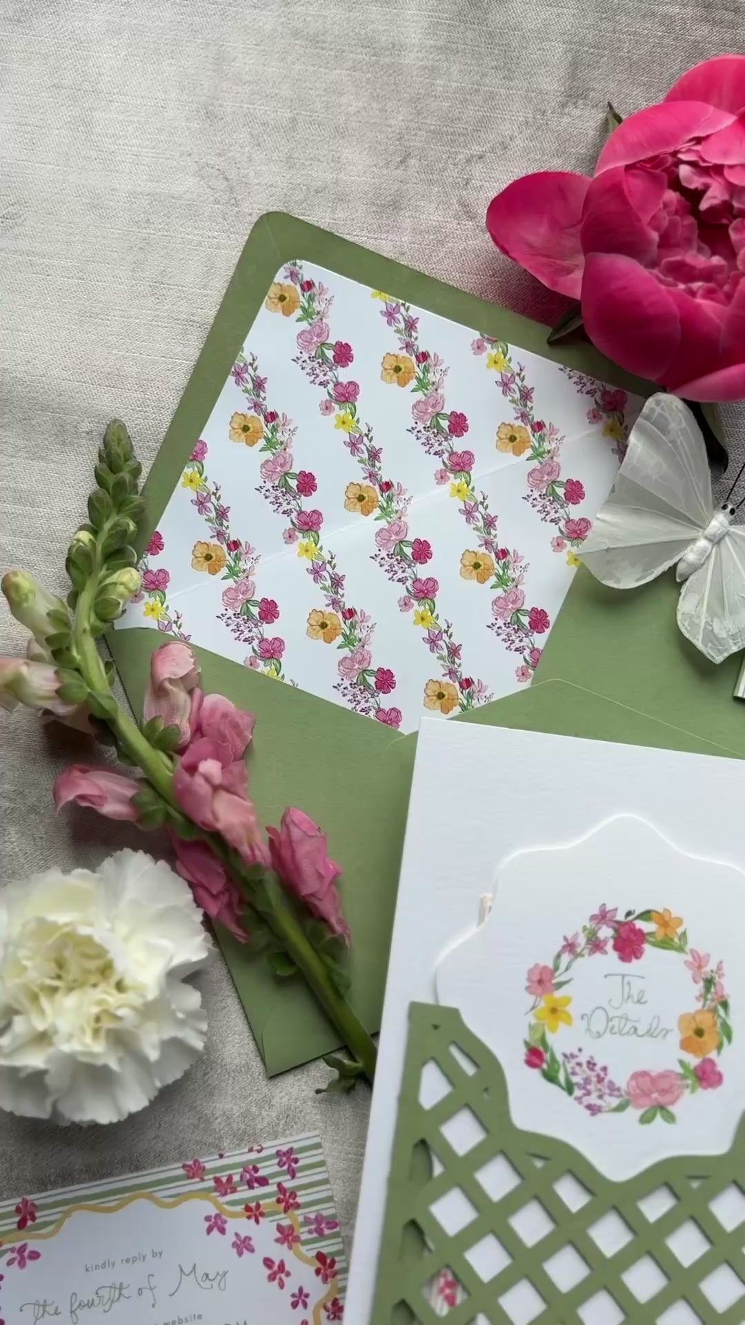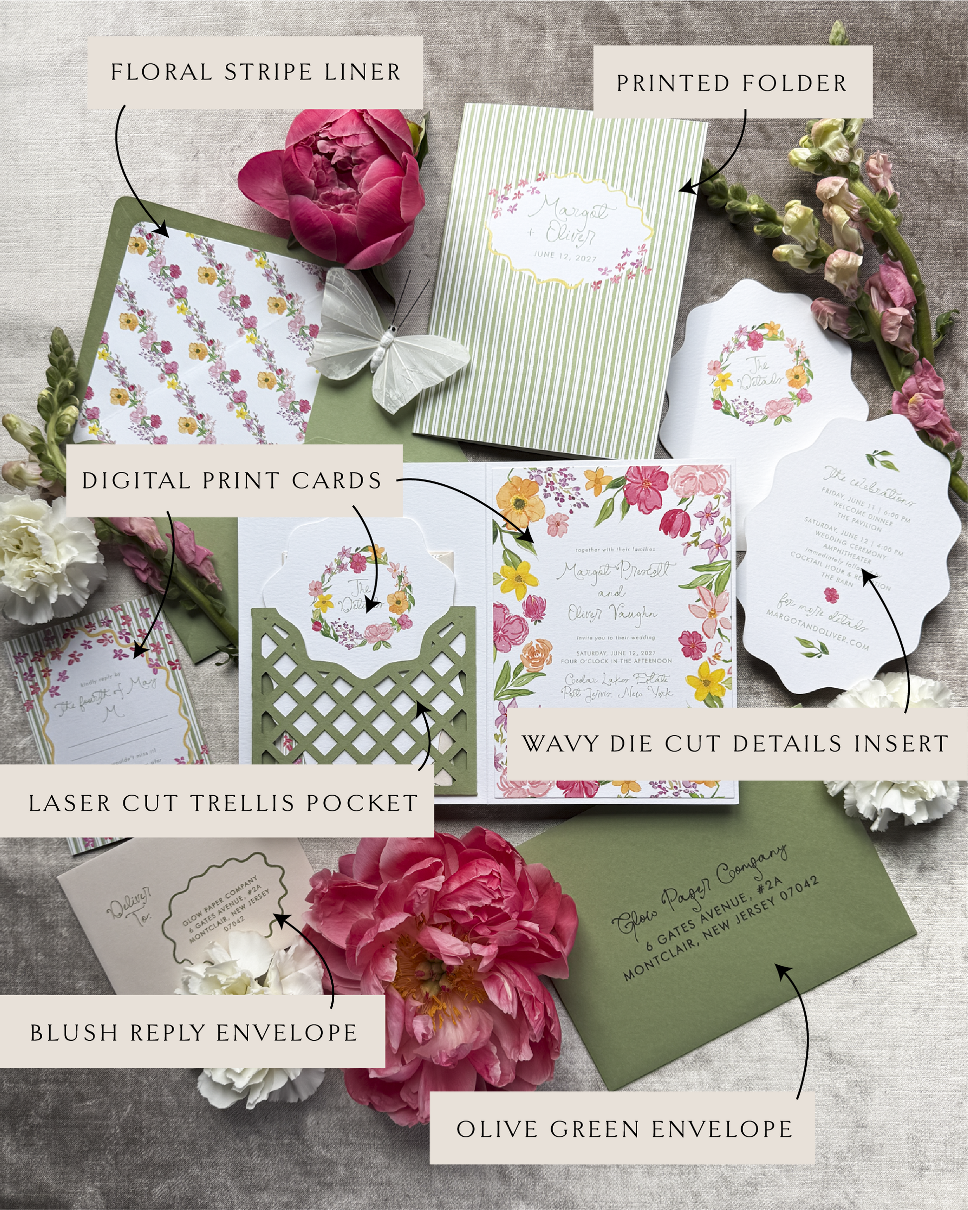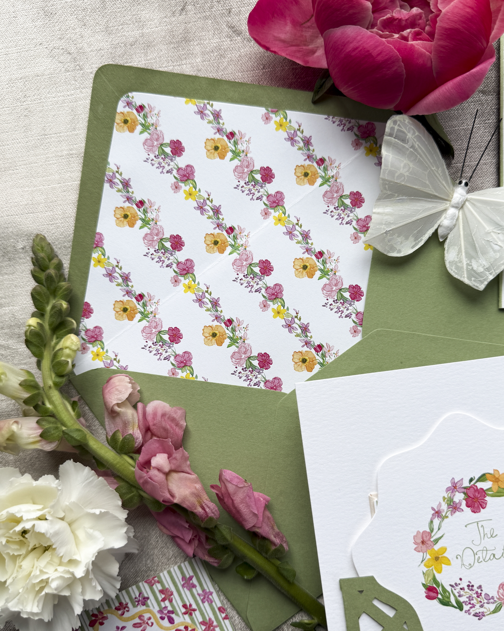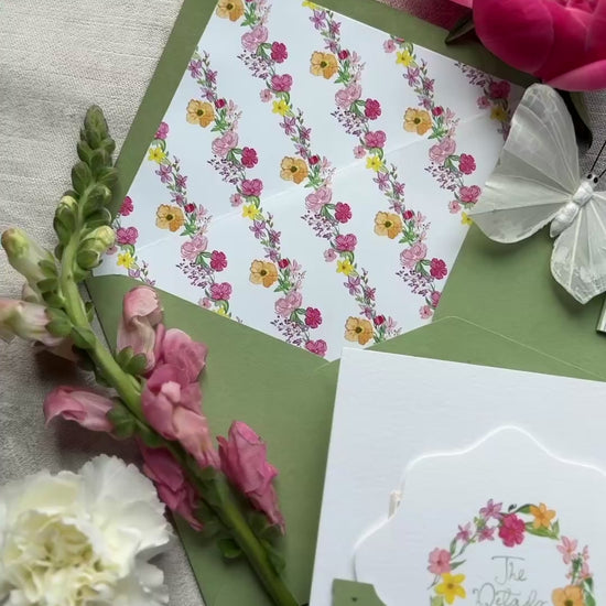 - Outer Envelope in Olive, digitally printed with guest address + return address, with Watercolor Floral Liner