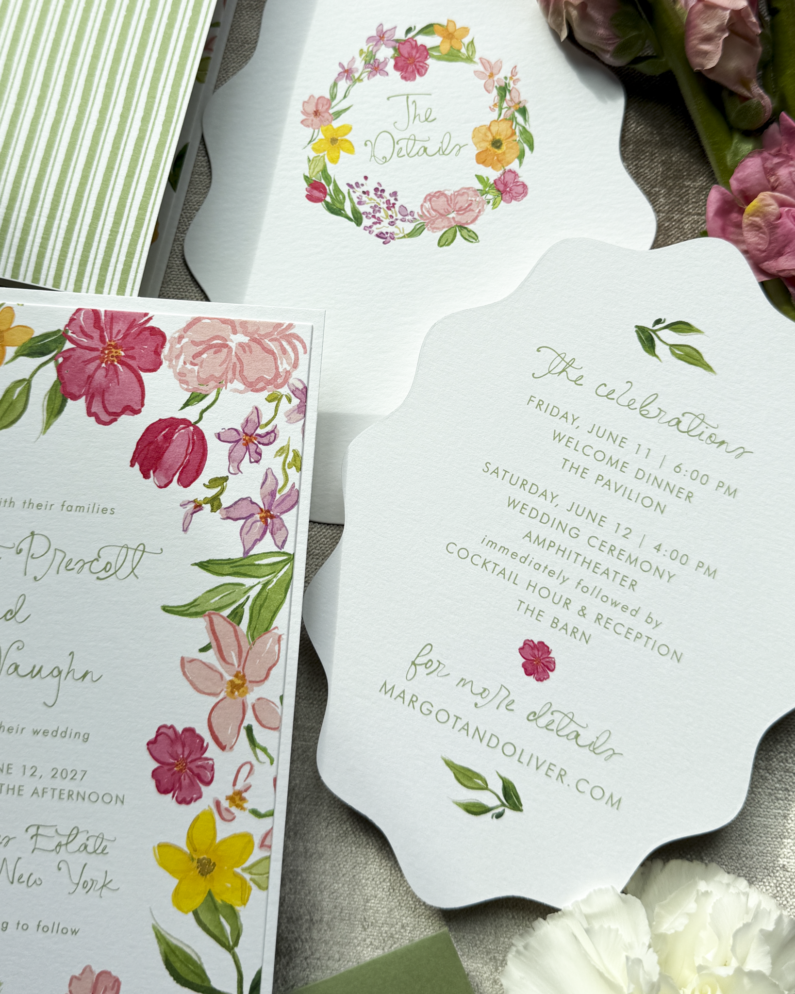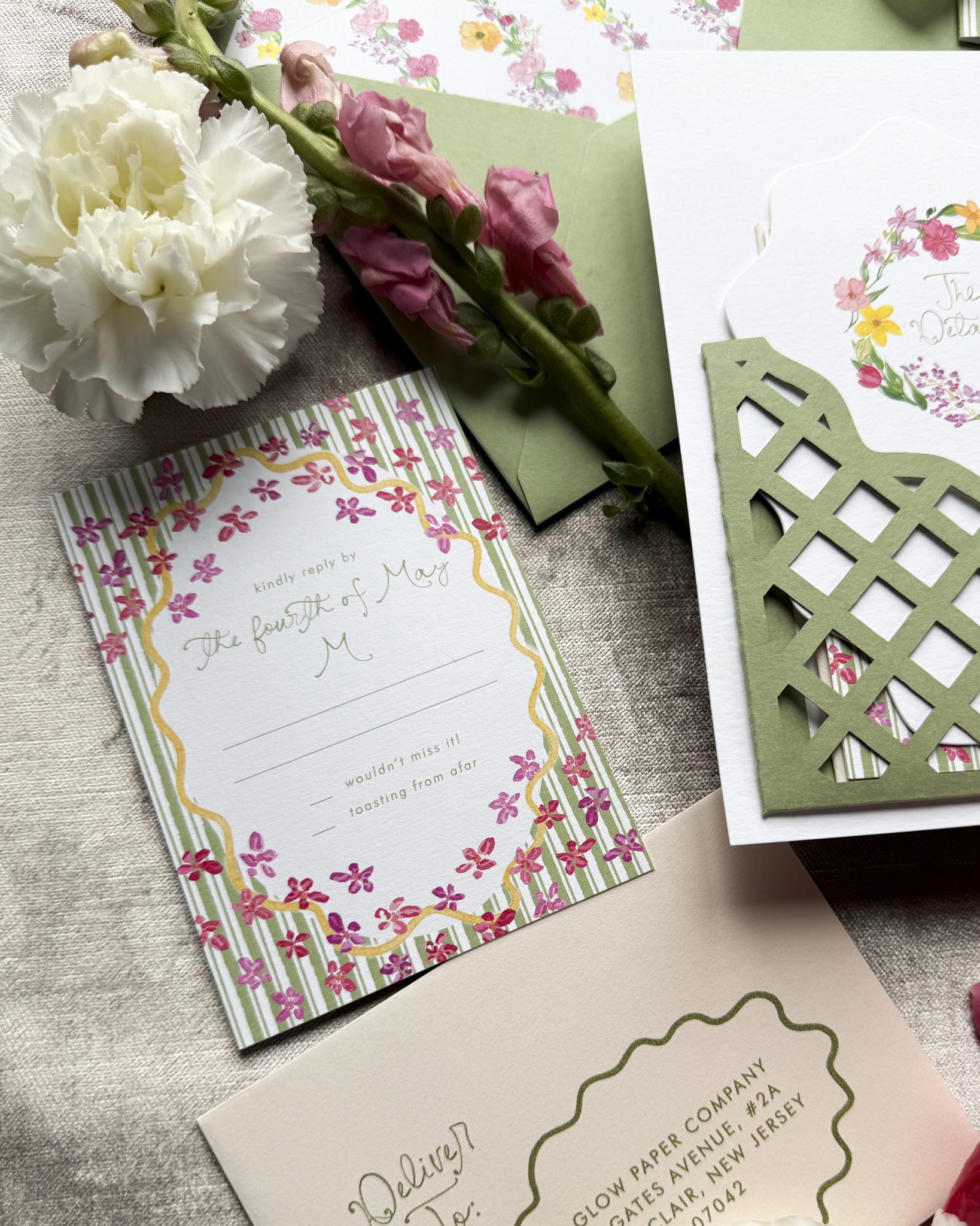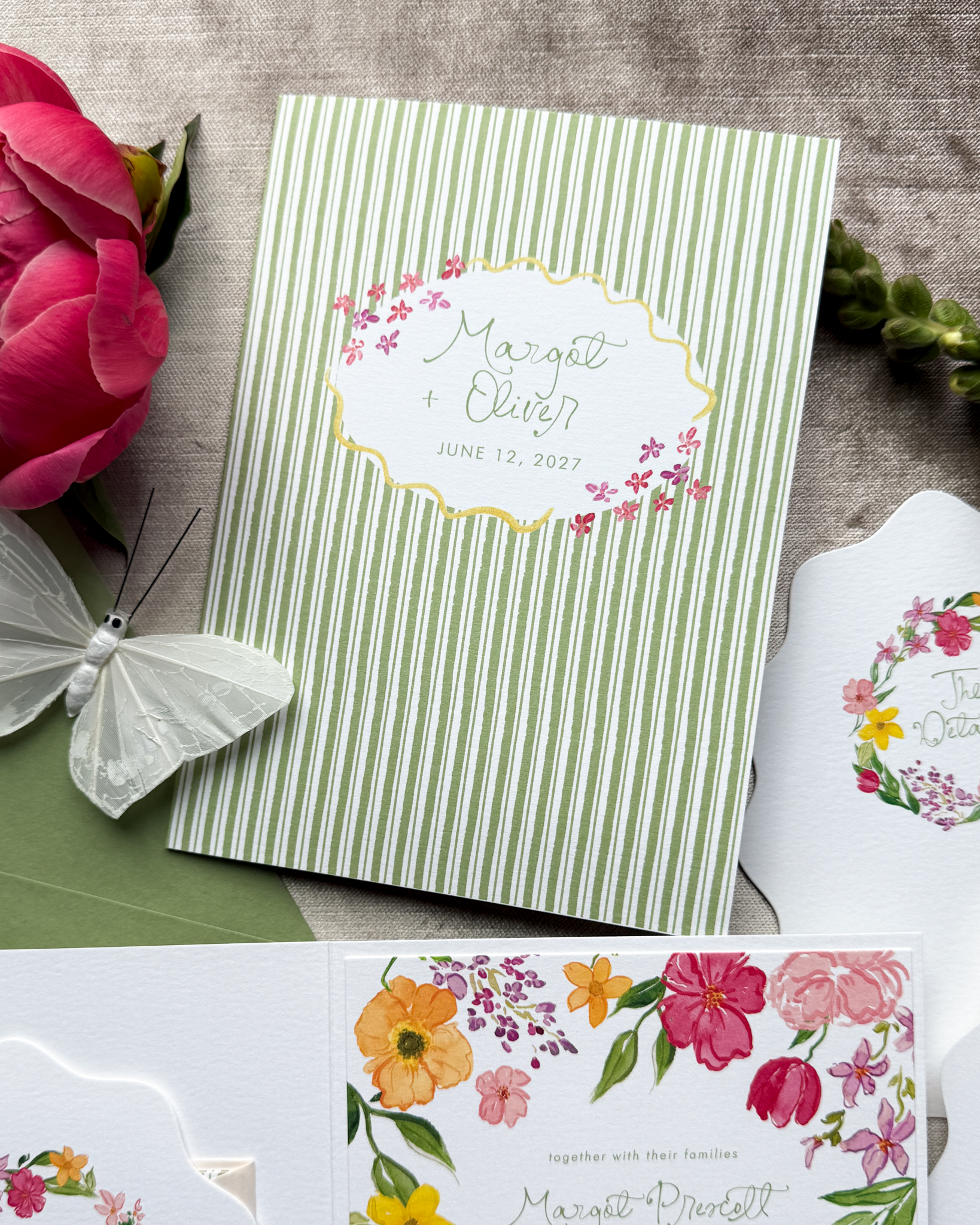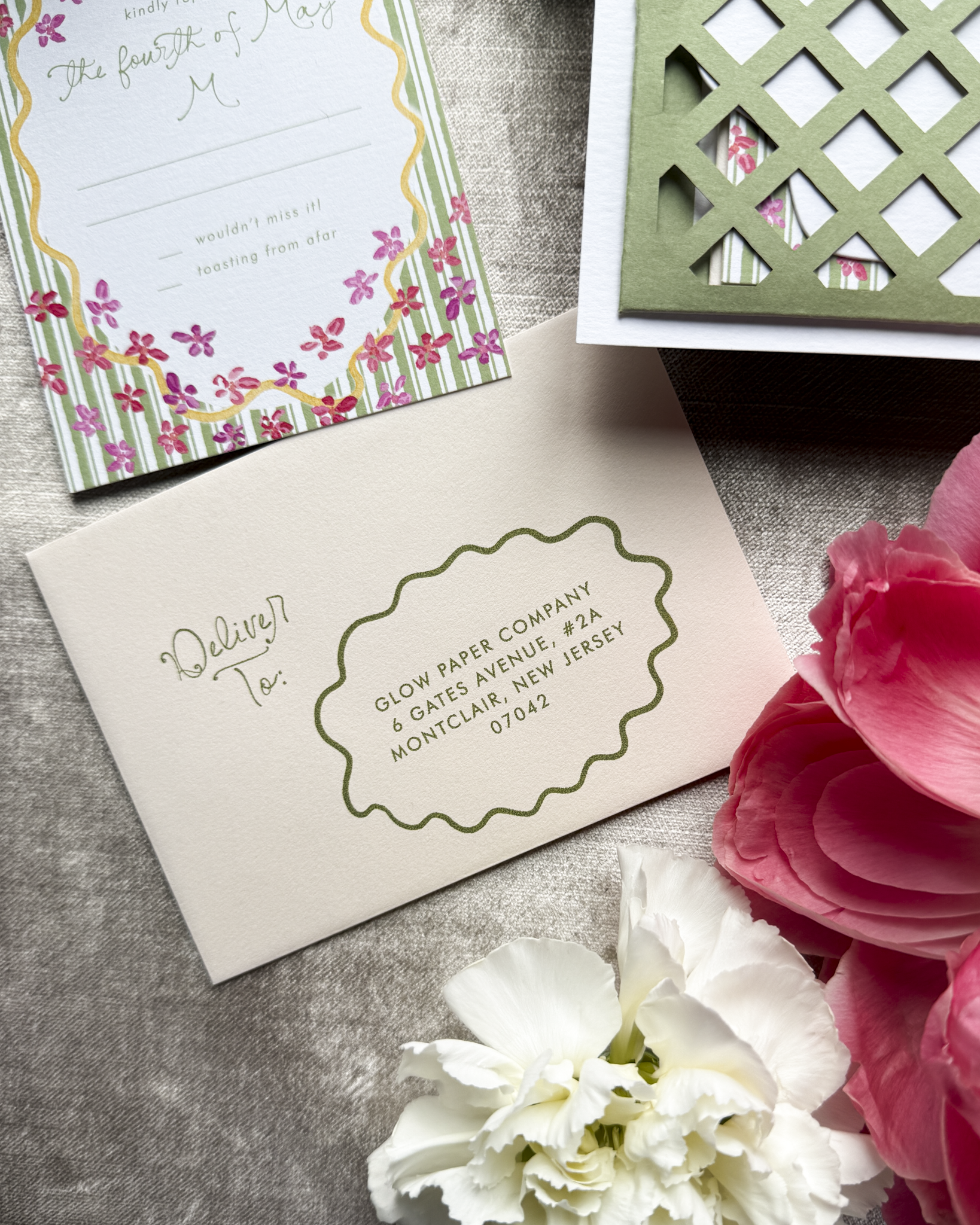 - Outer Envelope in Olive, digitally printed with guest address + return address, with Watercolor Floral Liner
