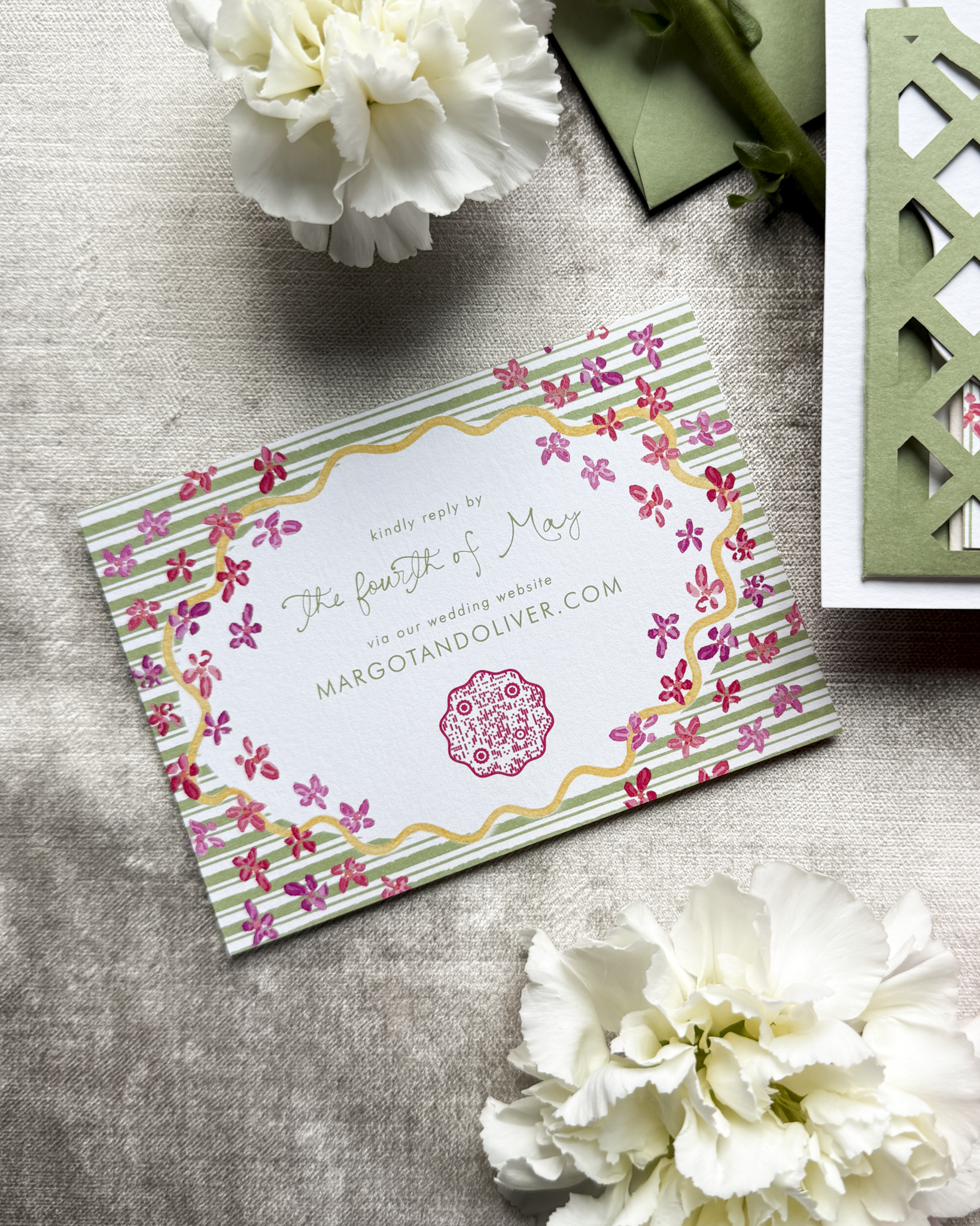 - 4.875 x 3.5 RSVP card, digitally printed on 1-Ply Bright White (can choose Off-White in the design process)