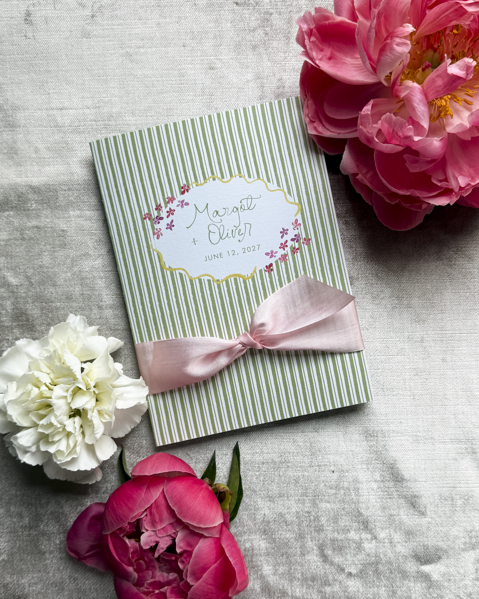 - After your purchase, you will receive a link to our Wording & Design Form to complete as soon as possible. This is where you will provide your exact wording for all pieces, and also make your final design choices (bright white vs. off-white, ribbon color if added, etc.)