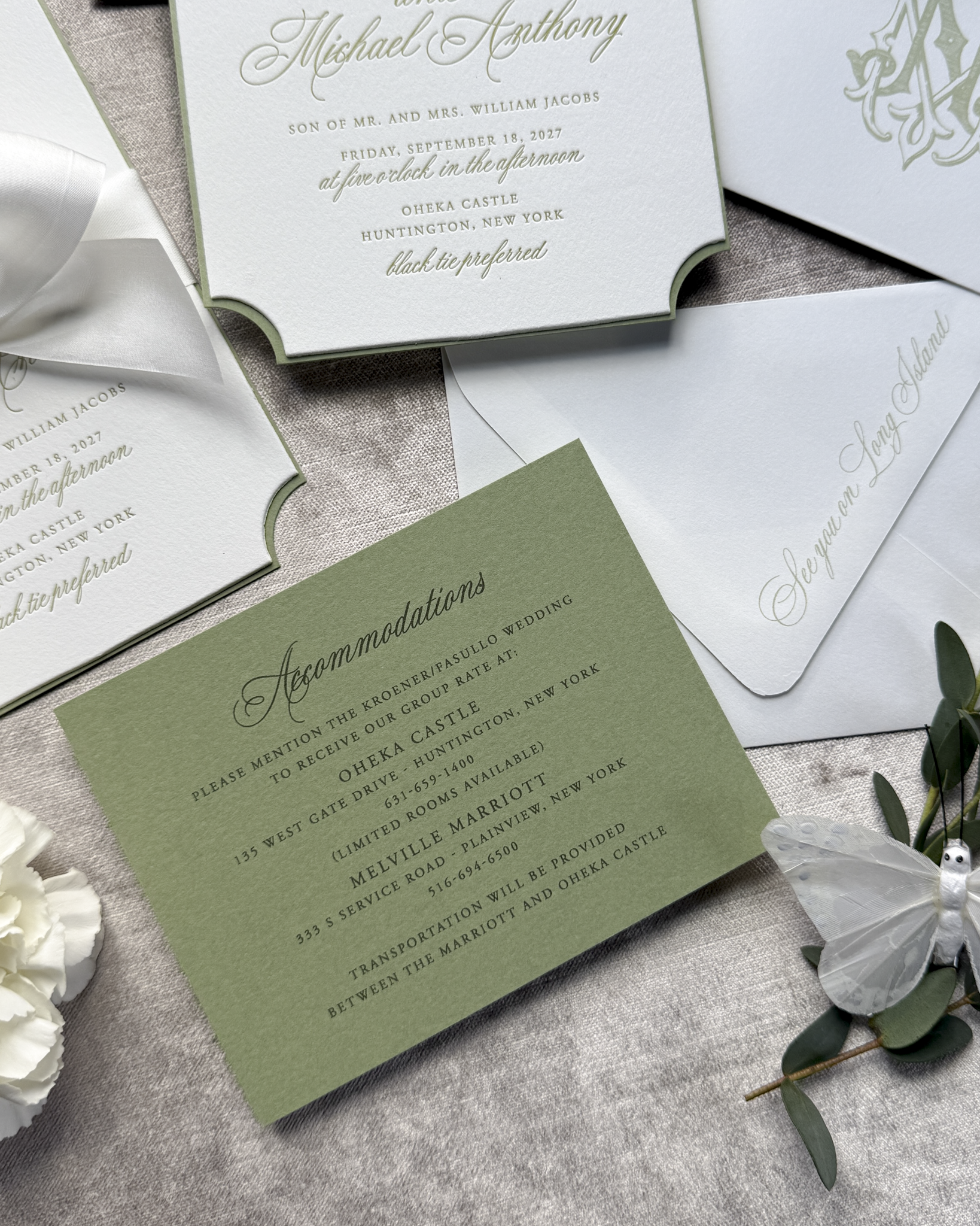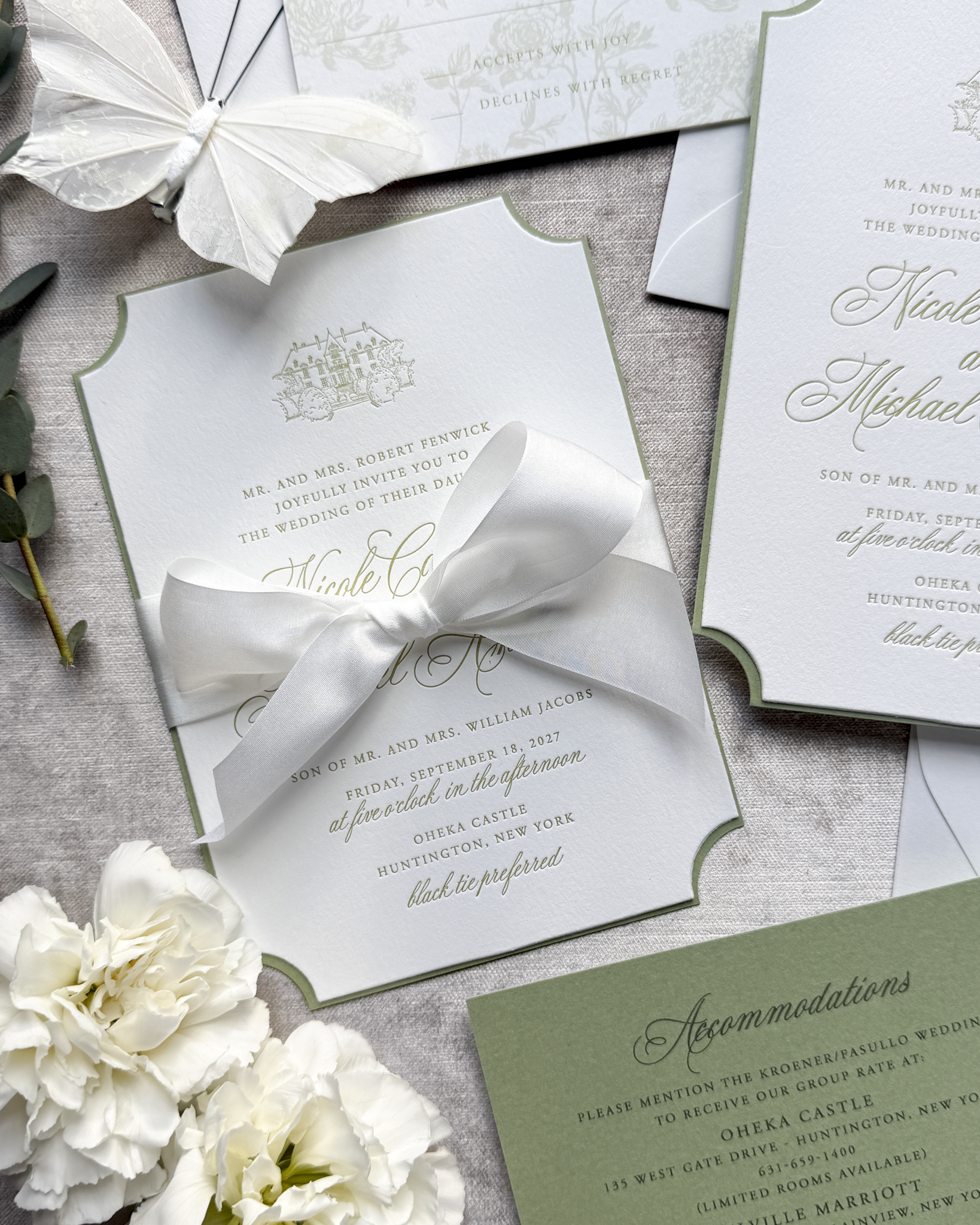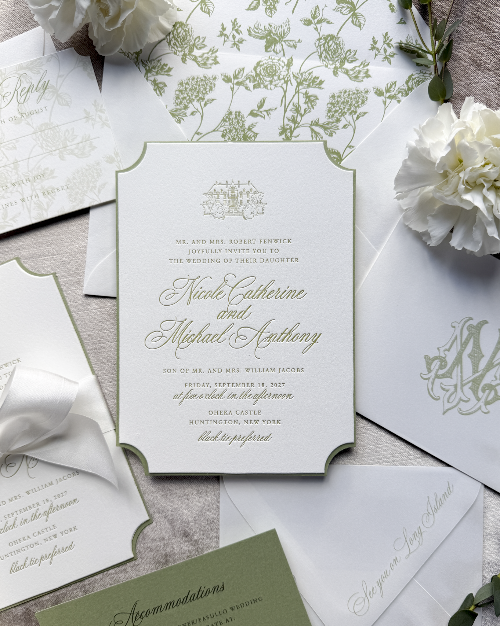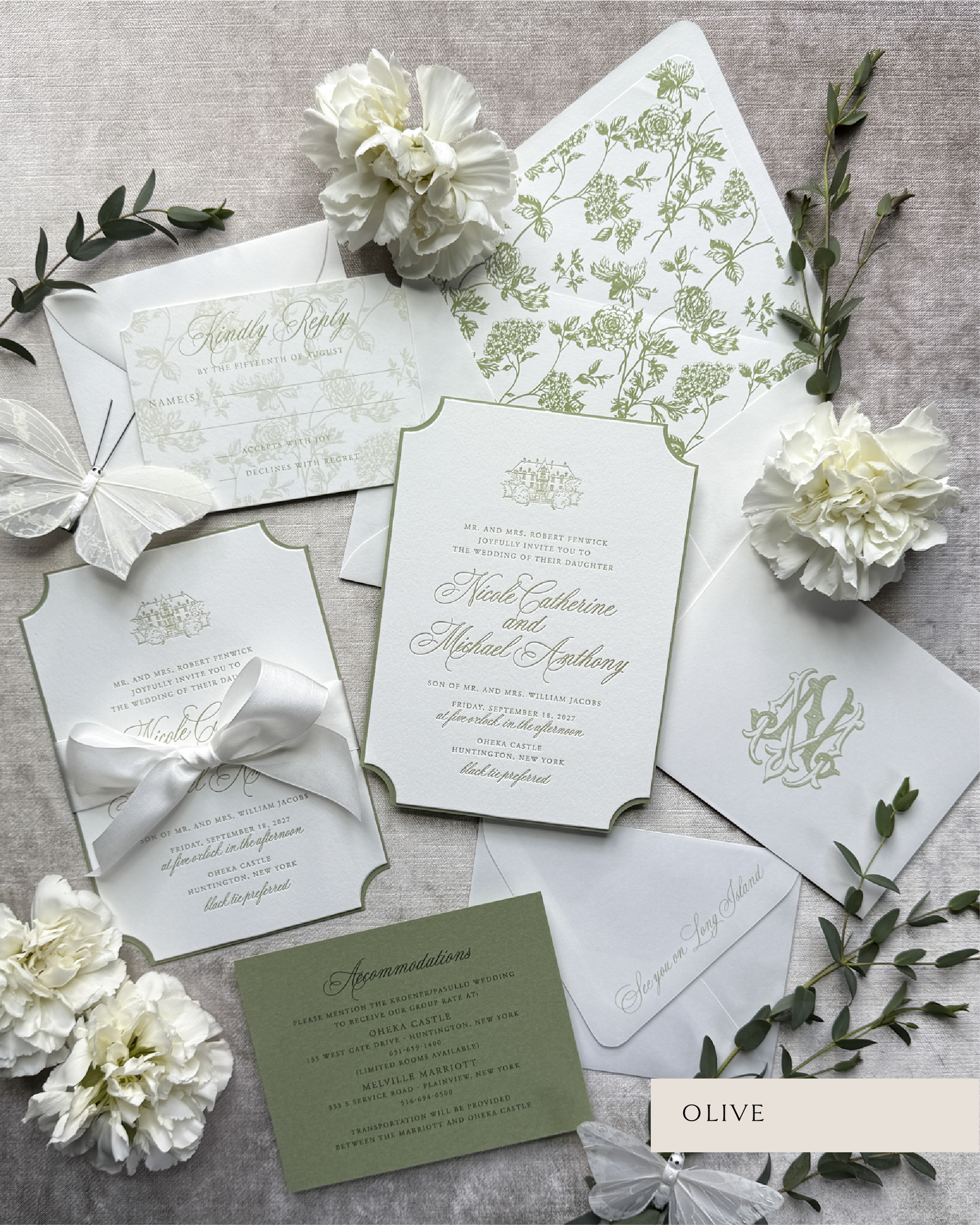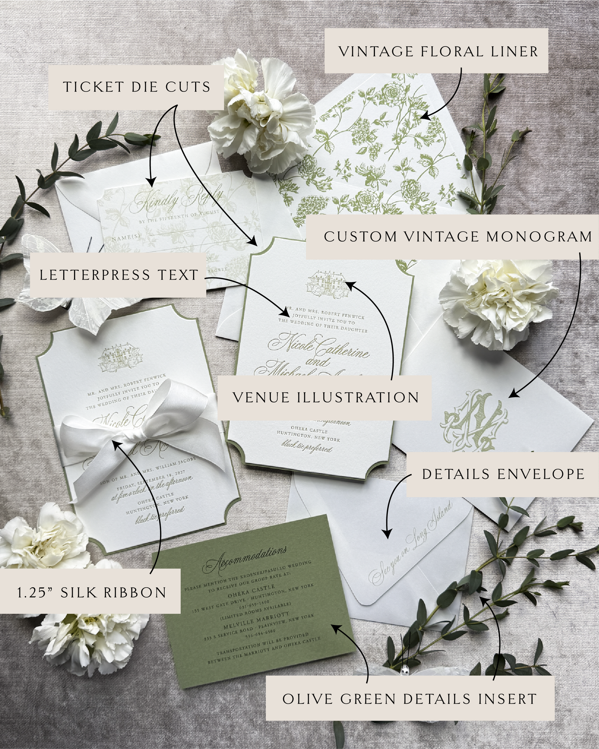 - 5 x 7 Main Invitation with "ticket" die-cut shape and custom venue illustration, Olive letterpress printed on 2-Ply Off-White (can choose Bright White in design process), mounted on an Olive backer that borders the invitation by 1/8 inch on all sides.