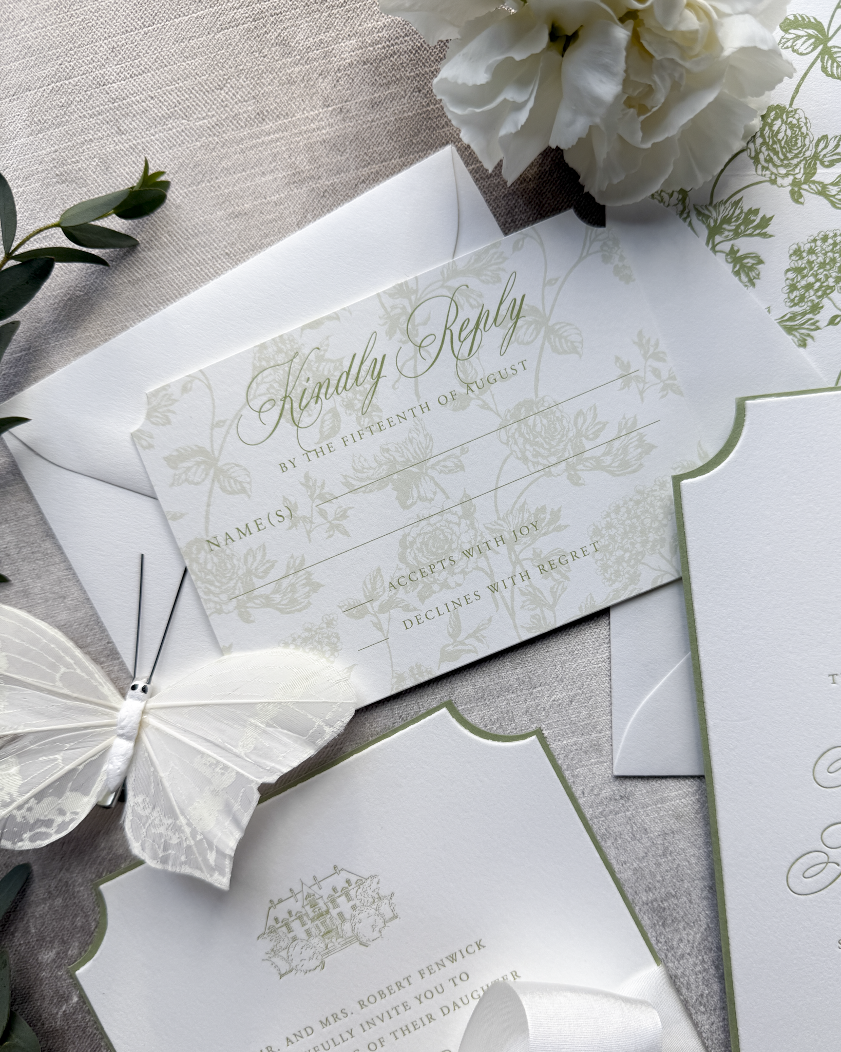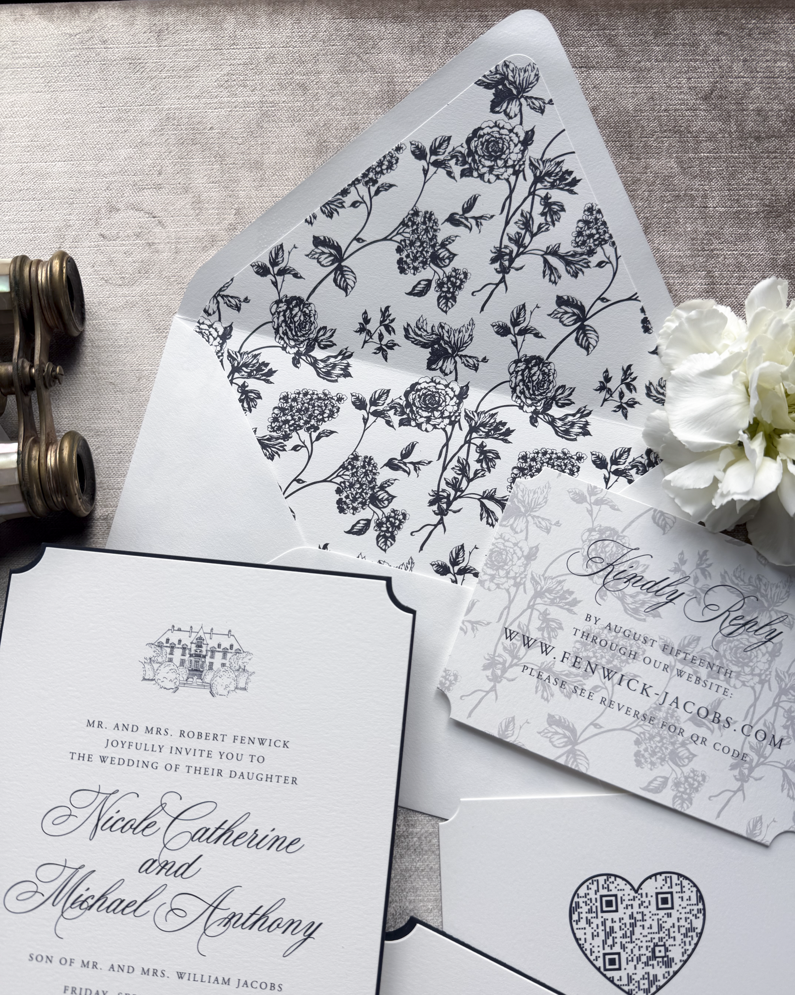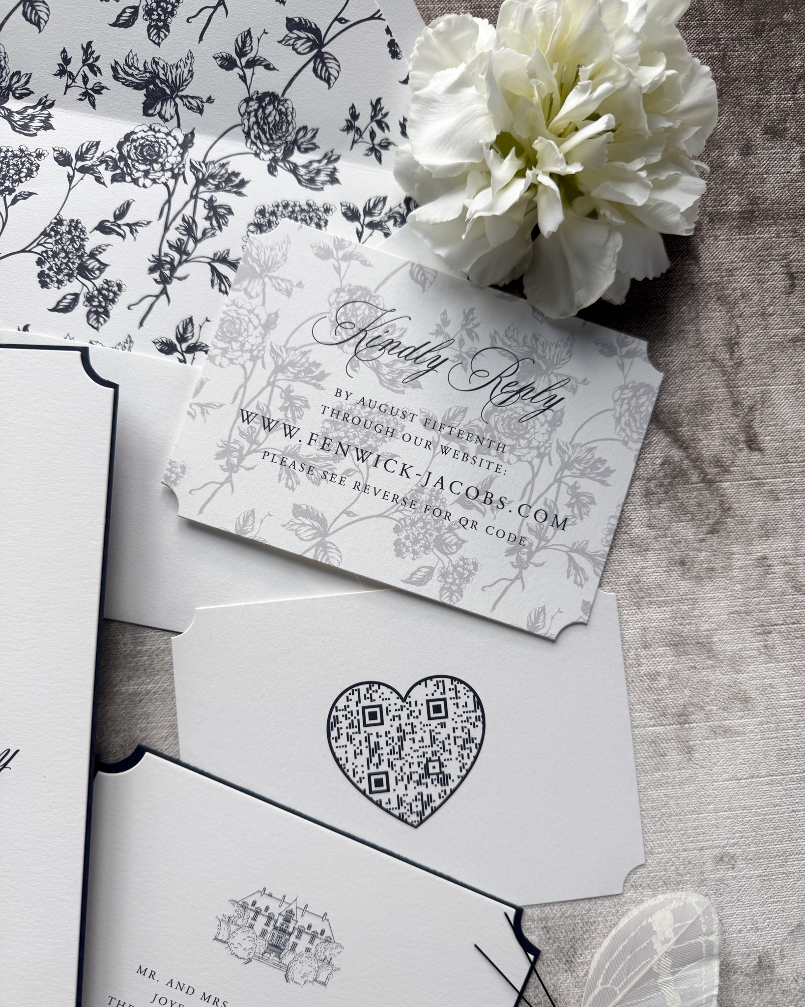 - Outer Envelope in Off-White (can choose Bright White in design process), digitally printed with guest address + return address, with vintage floral pattern liner