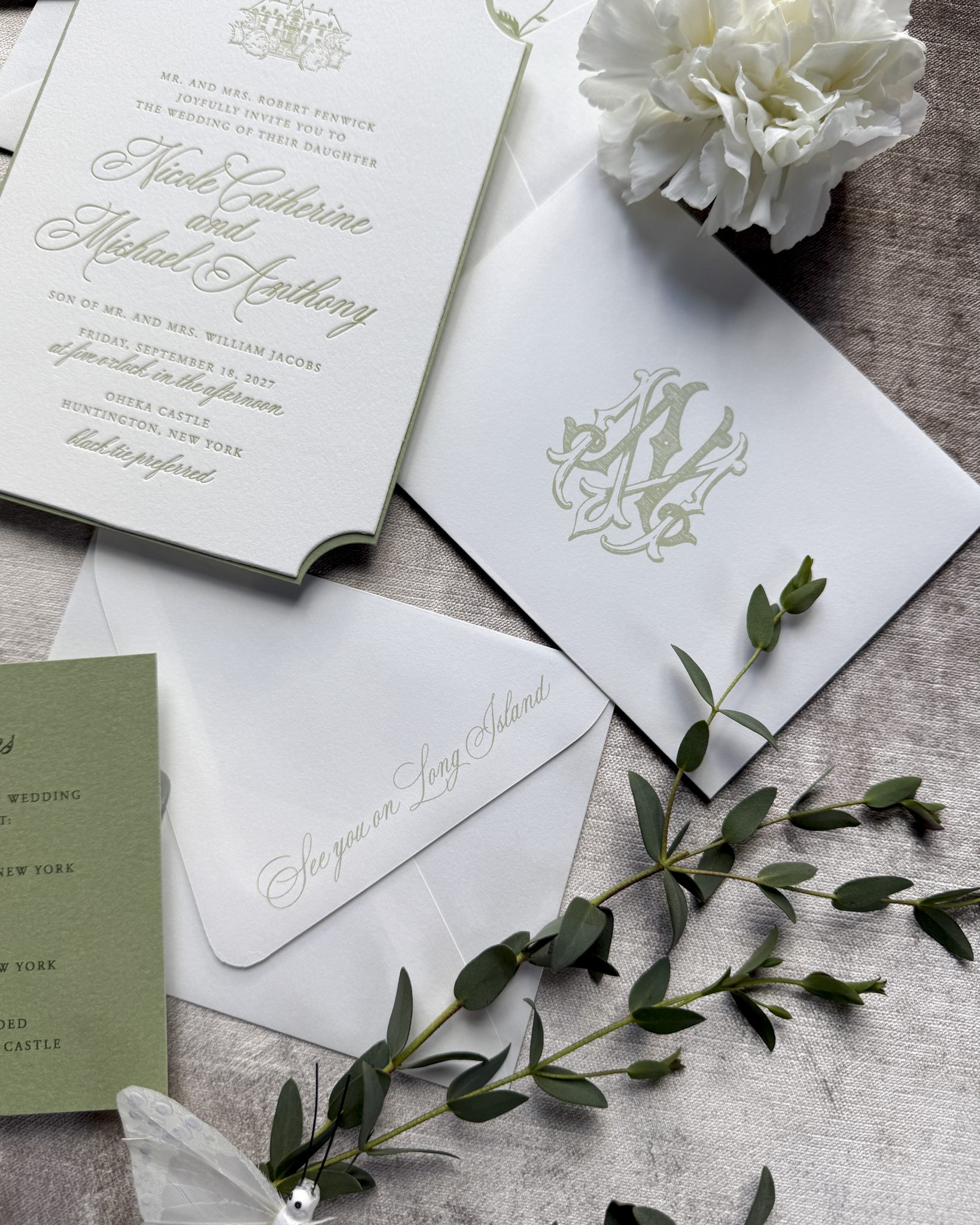 - Digitally Printed Details Envelope (to hold inserts) with custom vintage monogram on the front, and "See you in..." on the back flap