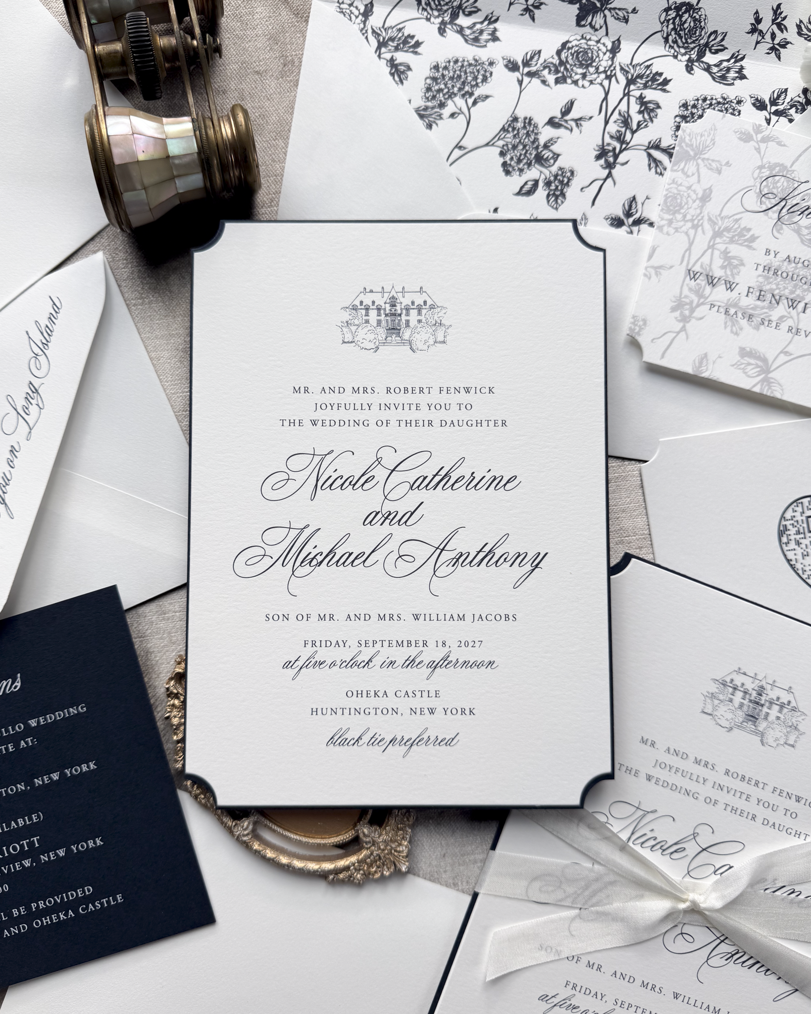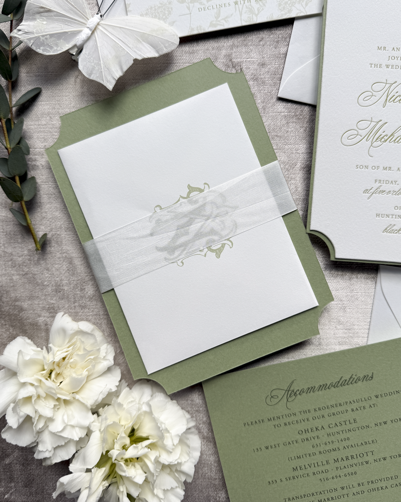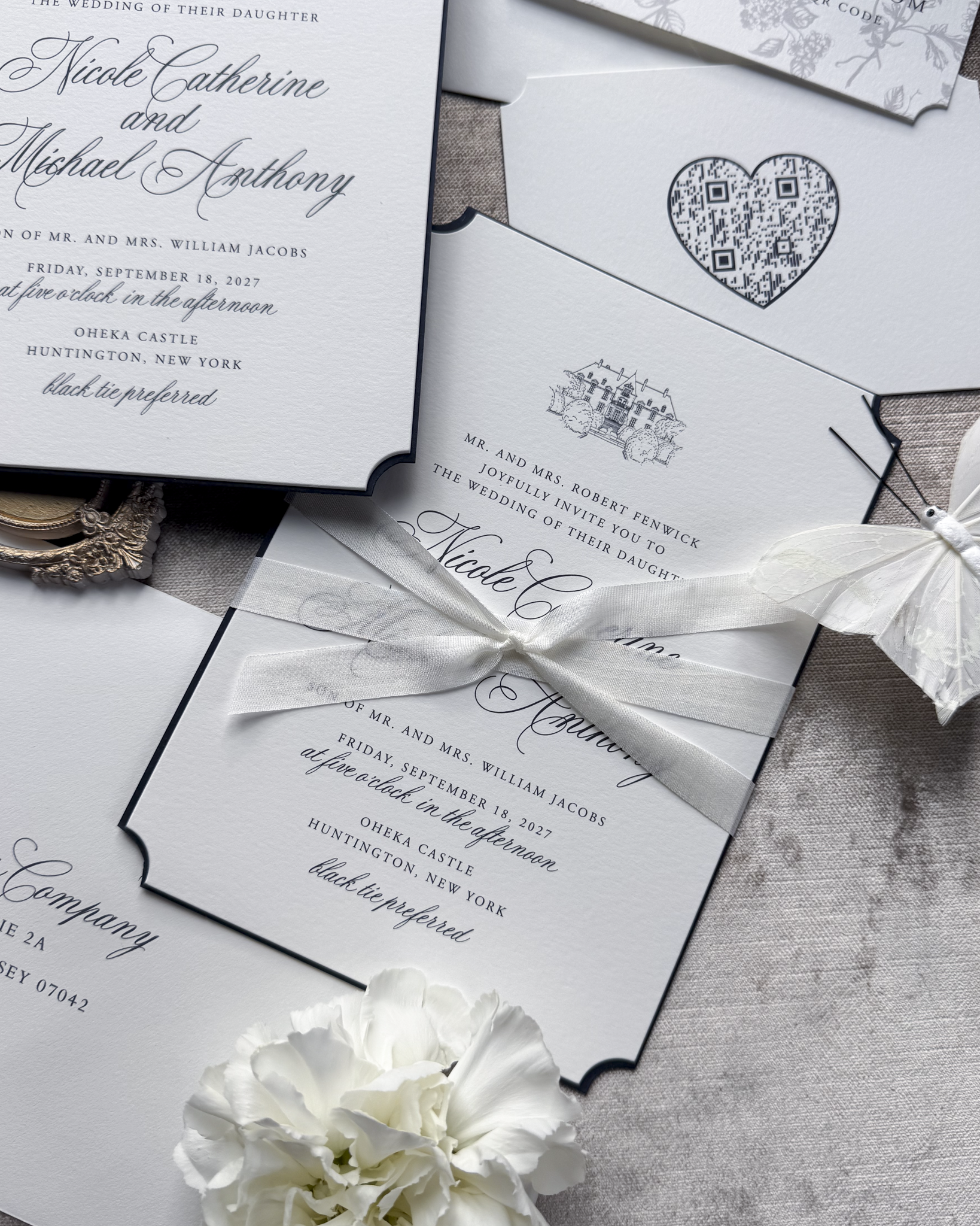 Select options below to customize your suite. A dedicated designer will be in touch to collect any design specifications that do not affect price (i.e. bright white vs. off-white paper color, venue artwork, monogram, ribbon color, etc.) along with all invitation suite wording after purchase.