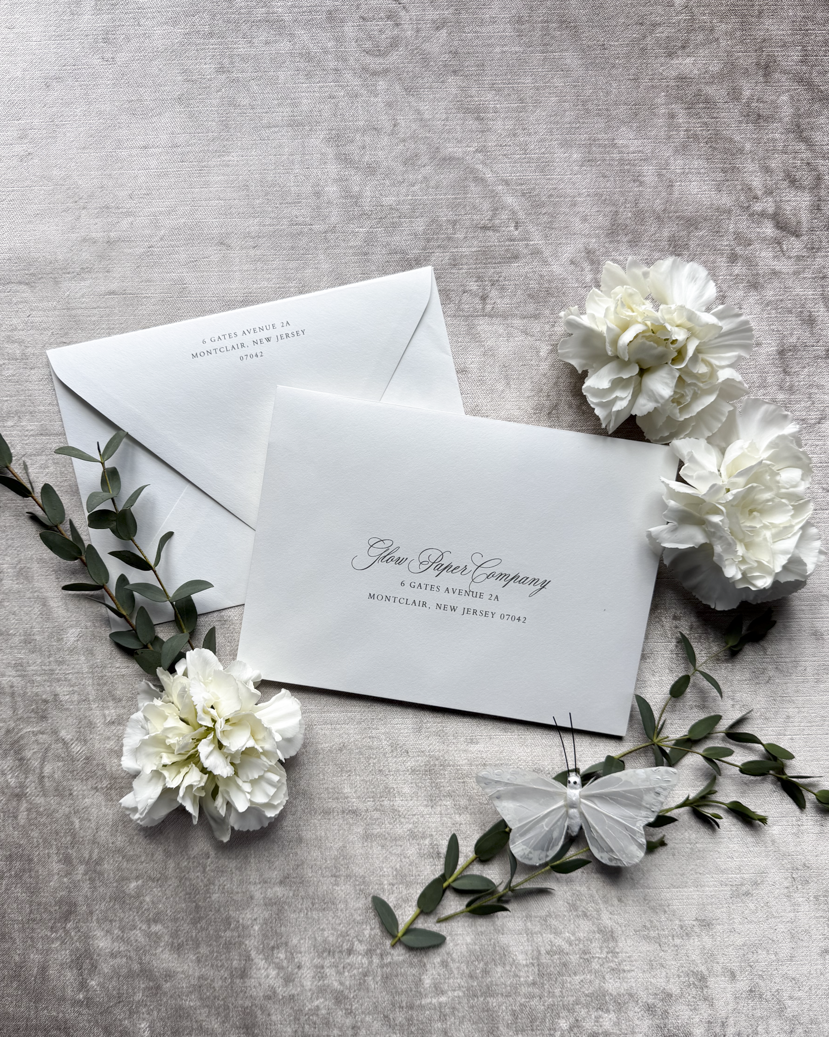 - RSVP Envelope in Off-White (can choose Bright White in design process), digitally printed with your return address