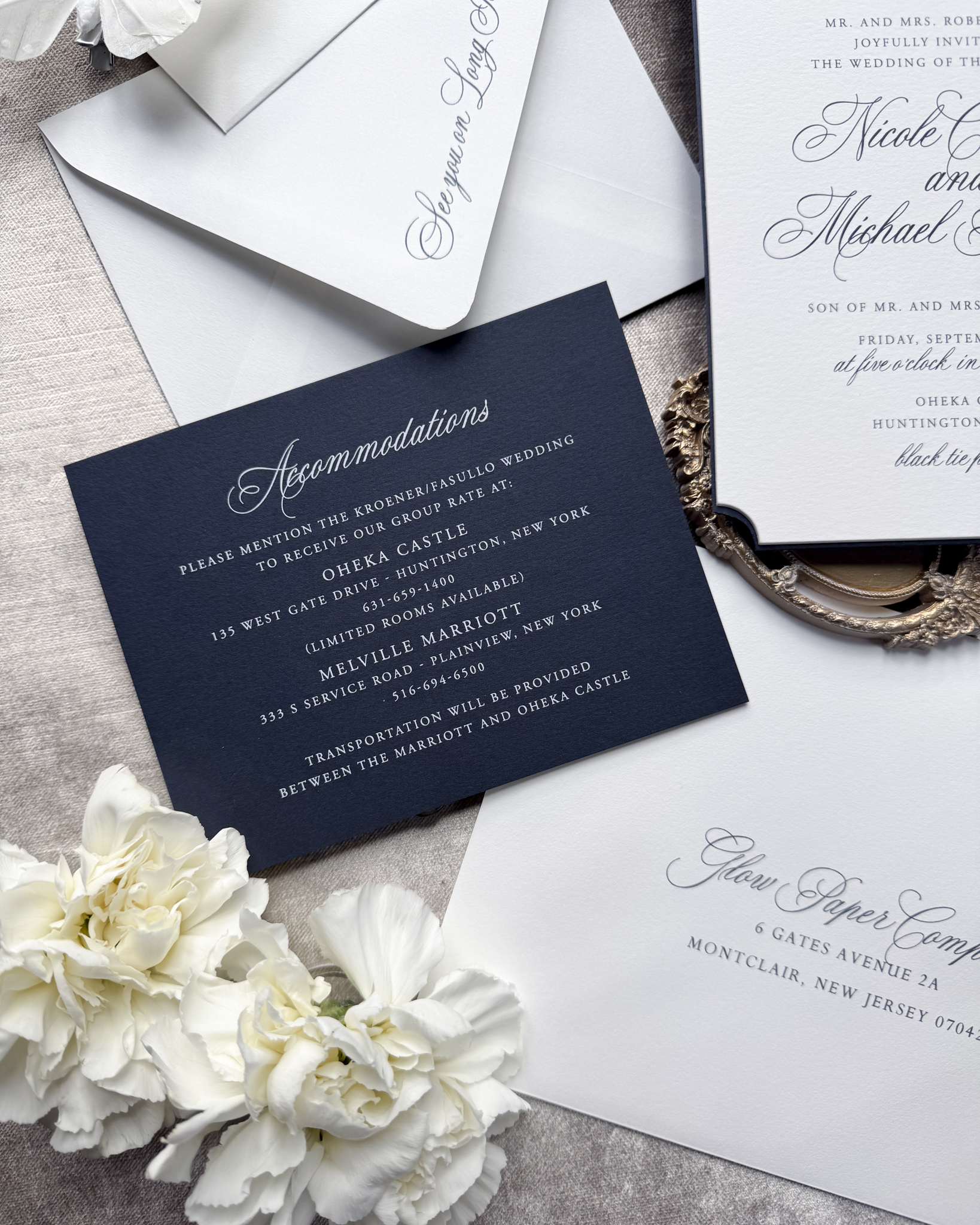 - Semi-Custom Invitations include minimal assembly completed by our team in our Montclair, NJ studio. Backer is attached, but not stuffed with inserts; Ribbons are trimmed to size but not tied; Assembly tips and instructions are provided here.
