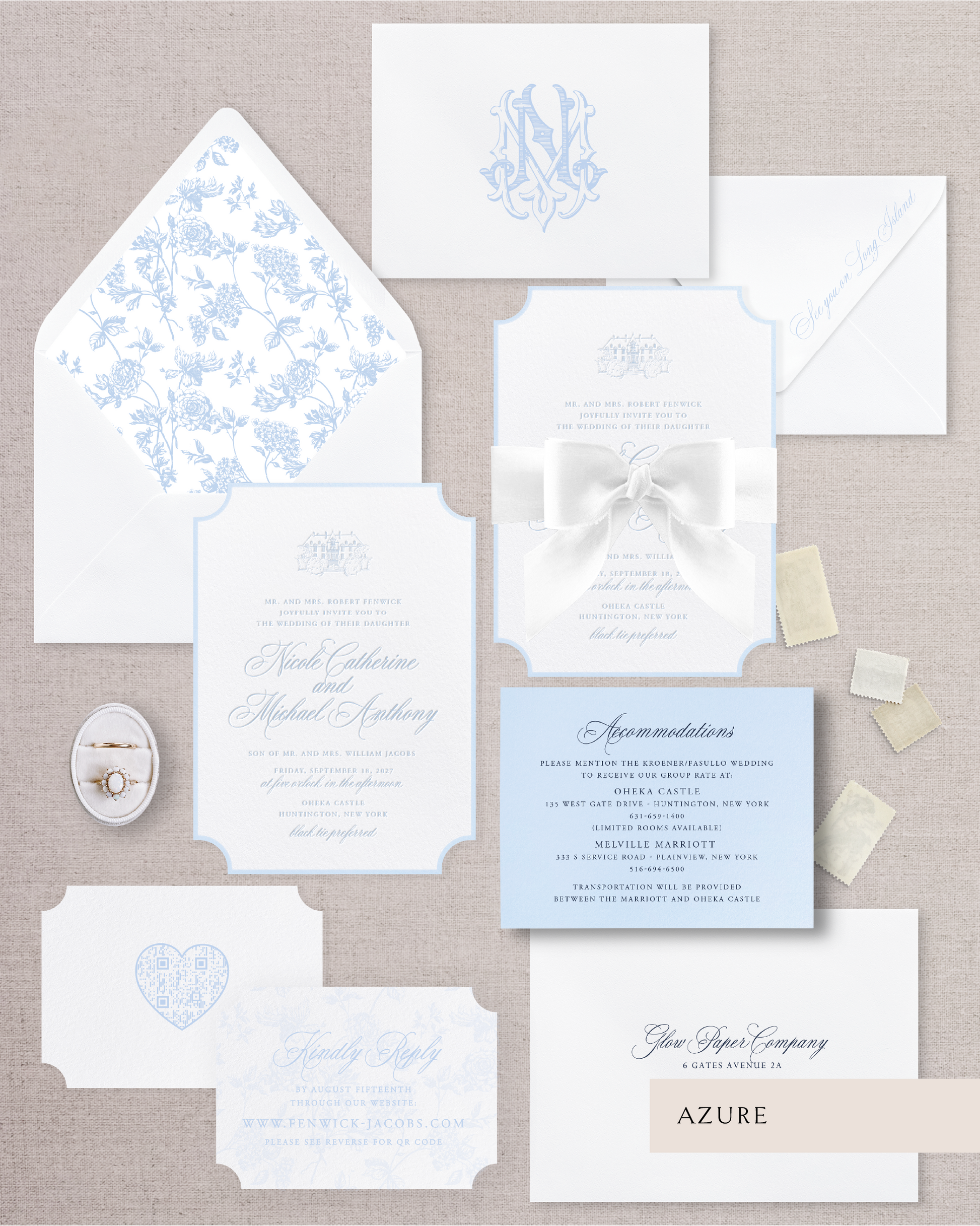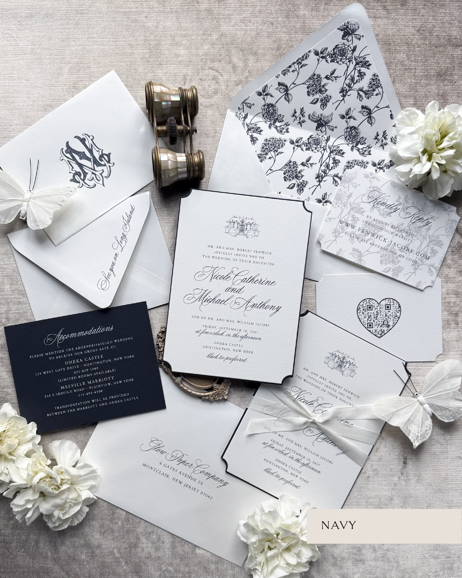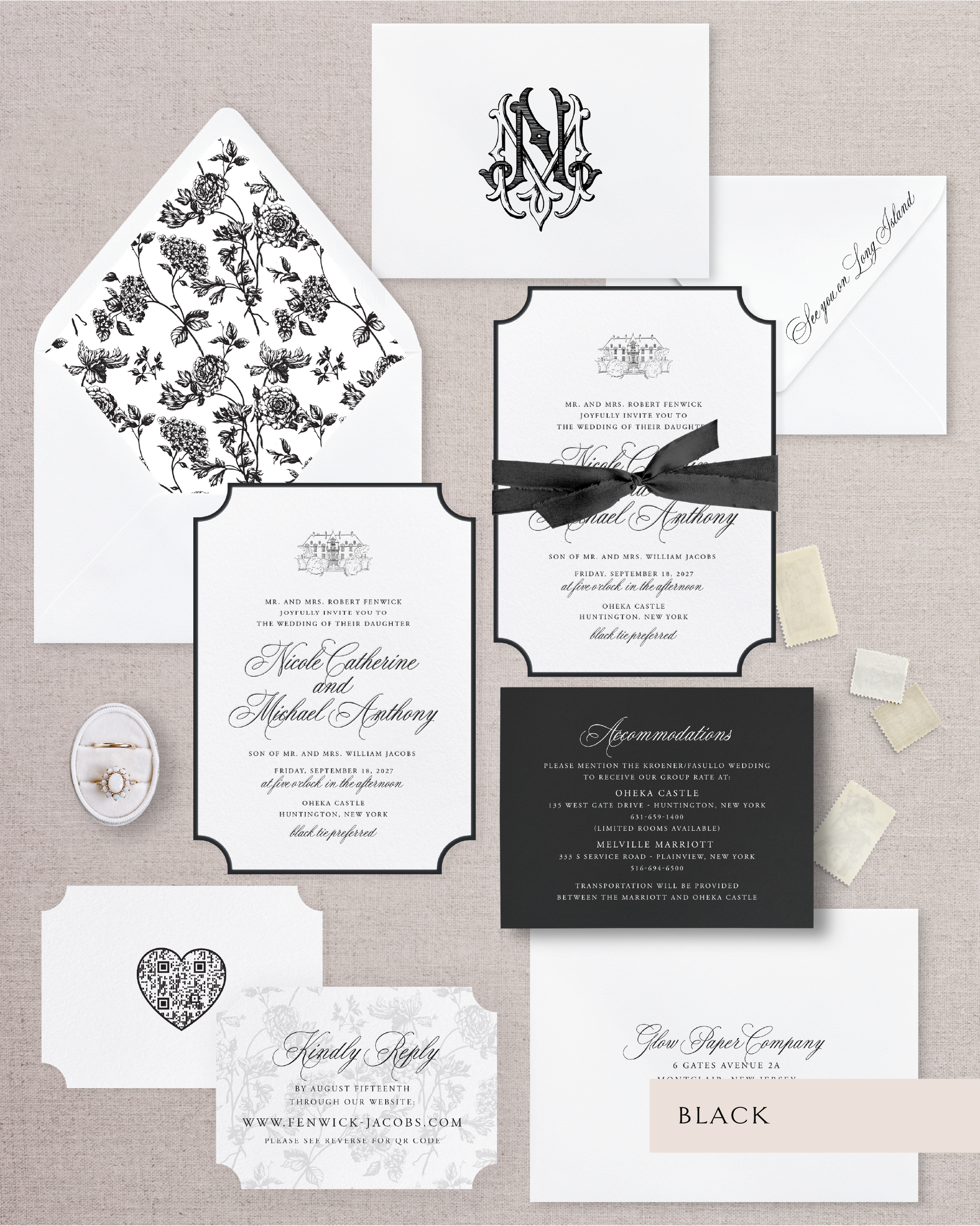 - After your purchase, you will receive a link to our Wording & Design Form and Guest List Spreadsheet to complete as soon as possible. This is where you will provide your exact wording for all pieces, and also make your final design choices (bright white vs. off-white, ribbon color, monogram, etc.)