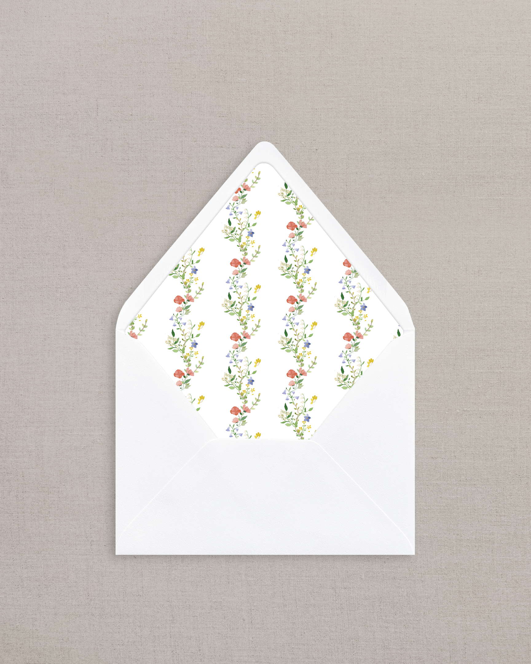 Euro Flap Eggshell Envelopes (Bright White or Off-White) with digital print liner depicting a hand-painted watercolor squiggle pattern of red and yellow flowers and greenery.